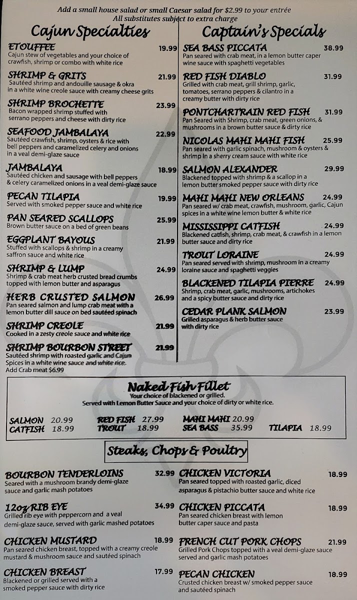 Pan seared served with crab meat, crawfish, mushroom, garlic, and cajun spices in a white wine lemon butter & white rice.